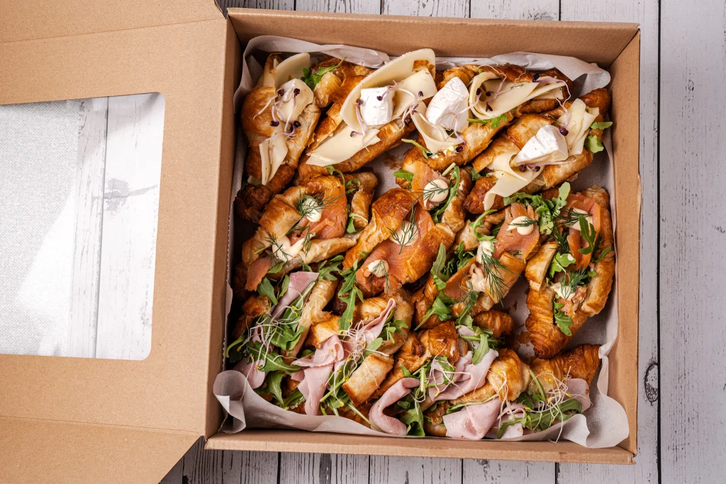 Mini Croissant Mix obsahuje tři různé druhy slaných croissantů po 4 kusech: šunkový (bylinkové máslo, šunka, rukola), lososový (bylinkové máslo, uzený losos, rukola) a sýrový (bylinkové máslo, ementál, hermelín). Všechny jsou čerstvě připravené a ideální na meetingy, snídaně či školení. Skvělá volba pro rychlé občerstvení s pestrou chutí.